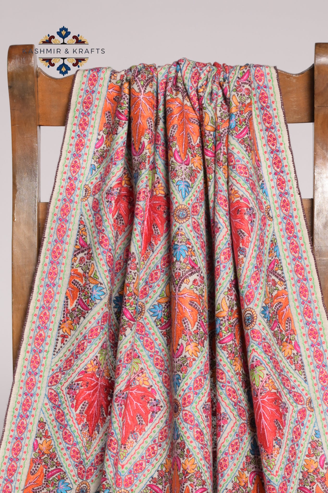 Craft Method: Entirely handcrafted – Handwoven Pashmina base with hand-embroidered detailing